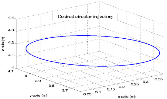 The manipulator is assumed to be at the initial posture rad corresponding to the end-effector initial pose (in the task space) of m. It is desired to move the end effector in the Cartesian space on the circular trajectory illustrated in Figure 21. The desired motion trajectory in the Cartesian space is defined as [26]: