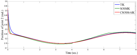 In [40], the authors addressed the rigid robot manipulator (RRM) tracking control problem in the Cartesian space in the presence of uncertainties. To compare and assess the control behavior of our proposed scheme (CSOSM-AIK) with the controller proposed in [40], computer simulations of the adopted CSOSM-AIK controller have been conducted to consider the tracking problem of the same rigid two-link planar robot manipulator shown in Figure 32.