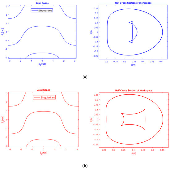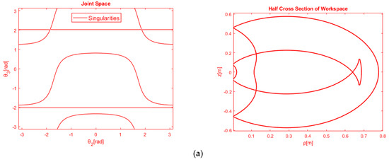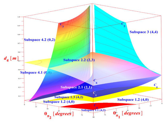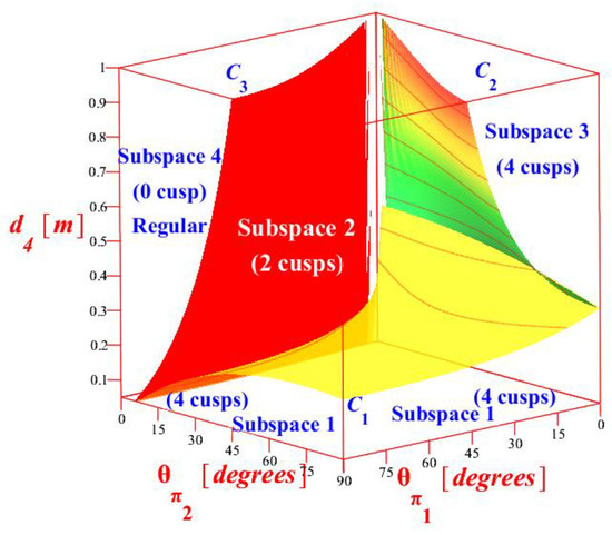 By the annulment of the determinant of the Jacobian matrix, the singular values could be determined. The investigation of det produces new separating equations [23] that effectively verify the bifurcation equations, which are derived from the solution of the parametric polynomial system. The new separating equations represent intersecting points between singular curves and straight lines in the joint space plane . Moreover, the topological feature of node is taken into account in this investigation. Node is a point in the workspace where the inverse kinematics admits two double solutions [21]. So, the node-based classification is done with pure geometric reasoning by looking at the continuous deformation of workspace [23]. Extra separating equations are produced, which allow us to enumerate both cusp and node points for the depicted kinematic topology in Figure 2. The results are displayed in 3D graphs with strict surfaces which depend only on the metamorphic design parameters . Finally, illustrative metamorphic anatomy is selected from each subspace of metamorphic design parameters 3D space and it is displayed so the singular curves and straight lines in joint space are mapped as the external and internal boundaries of metamorphic workspace.