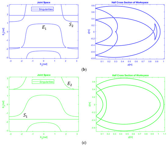 As it shown in Figure 4b the transition from subspace 2 with two cusps to subspace 3 with four cusps is characterized by a metamorphic anatomy for which the singular branch (line) defined by in joint space is tangent to the singular curve . So, the bifurcating surface separates the manipulators with two and four cusps such that,