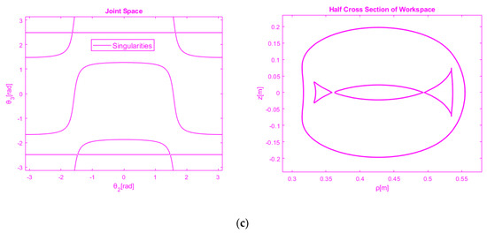 As it shown in Figure 4c the transition from subspace 2 to subspace 4 is characterized by a manipulator for which the singular branch (line) defined by in joint space is tangent to the singular curve . So, the bifurcating surface separates the manipulators with two and no cusp points (regular workspace topology) given by,