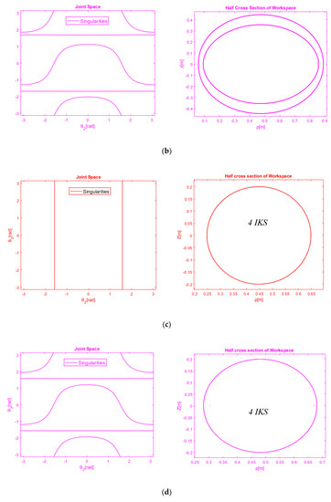 Figure 8a illustrates the transformation of metamorphic workspace with a variation of and m and the corresponding topologies are discerned with different colors. However, the number of cusp points remains constant and equal to four. Moreover, the internal singular segments tend to deform in both axes as well as the location of cusp points is changed too. Moreover, the ratios between the internal subregion i.e., 4 IKS and external one i.e., 2 IKS is changed too.