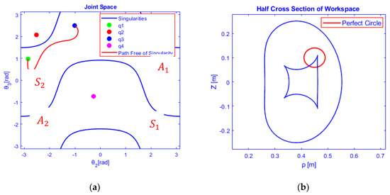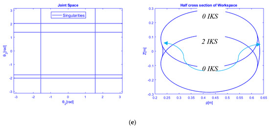 Left-hand rotation is selected i.e., and the TCP of the manipulator performs the circular motion in the half-cross section of the metamorphic workspace (see Figure 9b), as well as the path free of singularity, is traced in the joint space joining the third inverse kinematic solution to the first one in a continuous manner. Besides, the allocation of inverse geometric solutions sets in couples for each aspect is shown in Figure 9a. The joint path is smooth and does not cross any singular curve in aspect .