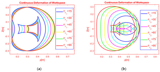 The two DH-parameters depend on the variation of the second passive joint angle as it is shown in Table 1. The variation of in . causes increasing variation for , decreasing and increasing for in , respectively. Consequently, the continuous change of the second pseudo-joint with m changes in a continuous manner the topology of the workspace as it is plotted in Figure 8b. The ratios of internal and external regions are varied, the number of cusp and node points is changing as well as the maximum reach of the end-effector of the mechanism is increasing. Moreover, it is also feasible to switch from generic to non-generic manipulators. Finally, the perpendicular distance from the first joint axes is decreased and as a result, the total workspace is placed closer to the local coordinate system of the base (see Figure 8b in horizontal axis ). Besides, the topological transition from cuspidal to regular anatomy is feasible only with the activation of angular rotation steps of .