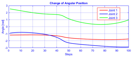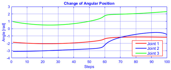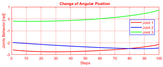 Furthermore, the joints angles are plotted in Figure 10 as a function of discrete steps for the circular path generation. The non-singular posture changing trajectory is feasible without encountering a singularity (outstretched or folded arm) and that can be useful for tasks where collision avoidance is needed.