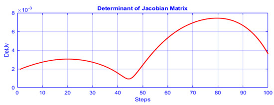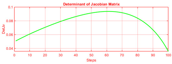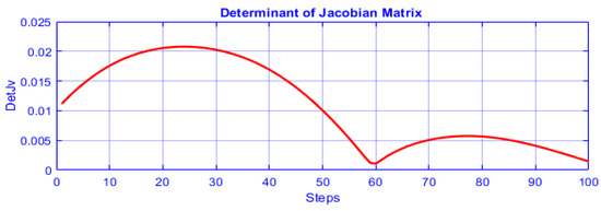 Finally, the determinant of the Jacobian matrix is plotted in Figure 11 as a function of the executed steps for a complete circle. The function of determinant is smooth and does not change sign or becomes zero. Moreover, the determinant’s morphology at the beginning of the path is different from the end of the closed path showing the change of posture. Consequently, determinant’s behavior verifies the singularity avoidance during the transition from an inverse kinematic solution to another one.