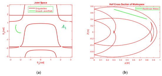 Anatomy is selected using the 3D graphs in Figure 15 and the kinematic singularities are displayed in joint space and workspace (see Figure 15), respectively. The anatomy belongs to subspace 3 with the respective design parameters . The topological knowledge of workspace helps the engineer to plan a linear, continuous and smooth path in metamorphic workspace. For this reason, the region with 2 IKS is selected to perform straight lines (two IKS).