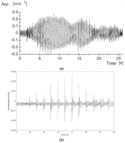 Example of the response in terms of vertical acceleration of (a) a low-frequency floor (e.g., 2 Hz) and, (b), a high-frequency floor (e.g., 11 Hz). Adapted from [35].