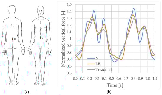 (a) Sensor positions (LB = fifth lumbar vertebra, used in this work; N = navel). (b) Comparison of ground reaction force (GRF, adapted from [8]).