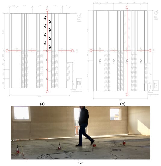 Plan view of the tested floor with the two arrangements of sensors used in the testing campaign (a,b). Locations A1–A4 mark the position of the reference accelerometers and of smartphones. A moment of Test 3. The person walking wears a smartphone at position LB of Figure 2, while a second smartphone is visible just in front of the person, near one of the reference accelerometers (c).