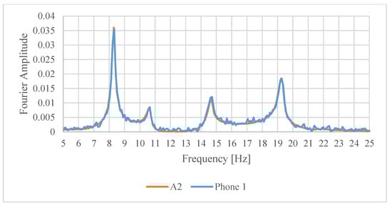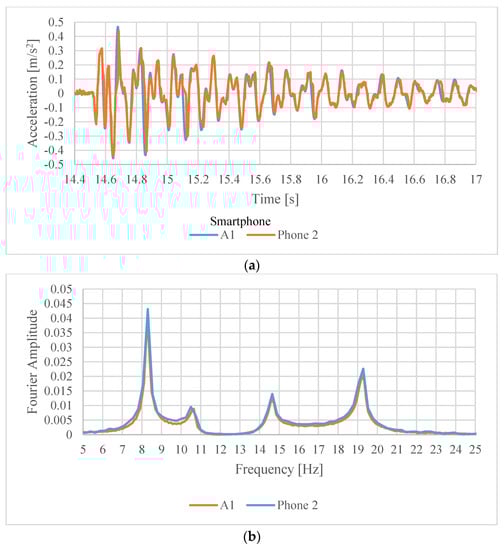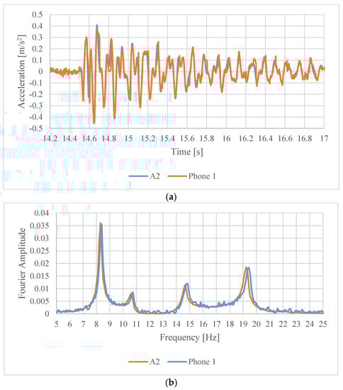 The acceleration signals recorded simultaneously by the two types of sensors closely match in time domain (Figure 6a and Figure 7a). The corresponding Fourier amplitude spectra shown in Figure 6b and Figure 7b, show the same in frequency domain for Phone 2. However, for Phone 1 it can be observed that the Fourier amplitudes are slightly offset to the right as the frequency increases. This phenomenon is due to the jitter in sampling frequency typical of android devices (see e.g., [21,22]). Although the sampling frequency was set to 200 Hz for Phone 1, in reality it was varying slightly during the data collection around this frequency, yielding the slight shift in the FFT.
