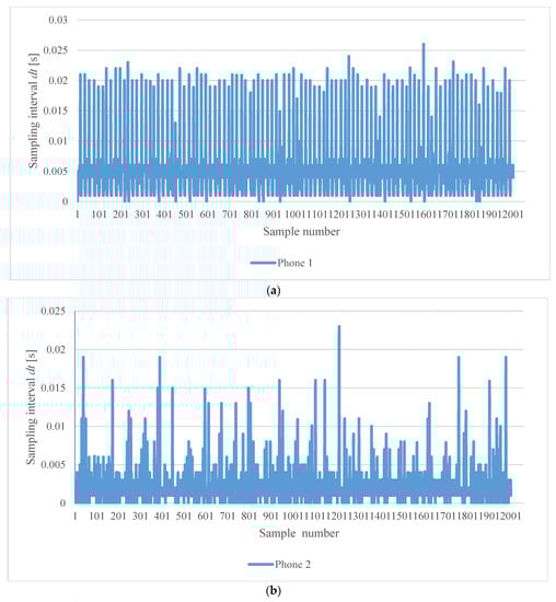 Variation of the sampling time interval for Smartphone 1, (a), and Smartphone 2, (b), during Test 7. The nominal sampling interval was dt = 0.005 s for Phone 1 and dt = 0.002 s for Phone 2.