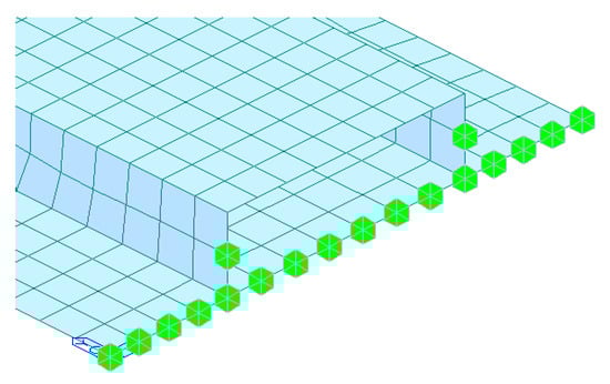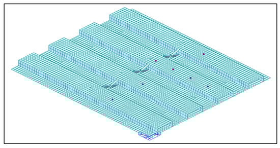 Numerical model of the floor system, developed inside the Midas Finite Element system. The marks highlight the position of the accelerometers in Figure 5.