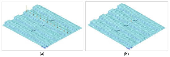 In model L1 the load is due to a series of independent consecutive steps. The loading consists in the GRFs depicted in Figure 14. These were computed inside the Midas Gen FE code on the base of the weight of the person walking and on its pace frequency fp. The GRF computed for the test was then applied at a set of discrete positions along the path by shifting it in time. The procedure to define the application points of the GRFs is the same for Test 3 and Test 4. First, the peaks corresponding to the impulses generated by the steps of the pedestrian were identified in the recorded time history, and the average pace frequency fp for the test was calculated. Then, the number of steps performed to cover the length of the instrumented girder was established. Finally, from the length of the girder and the number of steps, the average length of each step was estimated, and the position of each footfall determined. Positions similar to those marked by the arrows in Figure 15a results from the procedure. The parameters related to the two tests analyzed are reported in Table 5.