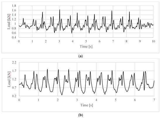 Loading L3 is computed as per Equation (3), with mp = G/g and G as previously reported for model L1. In this loading aM(t) is not the true vertical acceleration but the vertical, with respect to the smartphone orientation, acceleration recoded on the lower back (position LB in Figure 2) of the walking person with the smartphone. The nominal sampling rate was 200 Hz. The corresponding GRFs are depicted in Figure 16 for both tests Test 3 and Test 4.