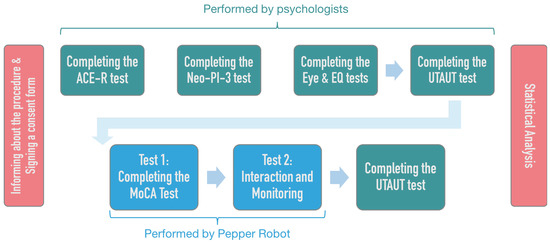 Testing procedure. The green parts were performed by a psychologist in a standard room. The blue parts were performed with the Pepper robot in the testing environment.