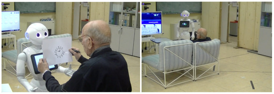 After completing the psychological testing, participants were invited to enter the home-like environment (Figure 1), then to interact with the humanoid robot Pepper. In the first task, Pepper engaged the participants to administer the different psychometric tasks of the MoCA test [26] and to record and store the users’ scoring. The MoCA robotic administration is performed by providing verbal instructions for the tasks using text-to-speech and animated speech. To receive and analyze the user’s input, we rely on speech recognition and face tracking facilities, image analysis, and the robot’s tablet. See Figure 1 (left) for an example.