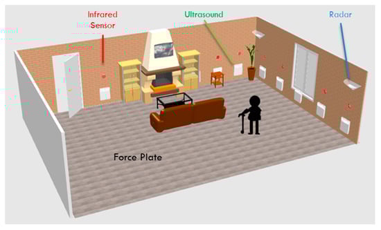 Apart from wearable devices, there are ambient based and vision based systems which can monitor human posture to detect falls. Fall detection systems based on wearable sensors are non-sensitive to the changing ambient environment since they do not consider the dynamic environmental factors that might affect the detection. However, ambient systems, as shown in Figure 1, provide a solution by collecting data from the user as well as examining the environment. These systems make use of external sensors which are installed around the user’s daily active area, such as a home or senior care facility, and monitor the posture of the humans in a fall event with some factors such as the time spent in falling. Current research on ambient systems for fall detection are based on (i) ultrasonic signals/radar, (ii) Kinect sensor, (iii) microphone, (iv) pressure sensor, and (v) infrared/Wi-Fi signals. The parameters observed by these sensors are mostly (i) motion of the human (ii) posture, (iii) pressure on the ground, (iv) acoustic, and (v) time spend in falling as well as the time spent on lying on the ground after fall. Since these parameters are different for each person and each fall event, these systems use pattern matching or machine learning algorithms to detect falls rather than using a threshold value.