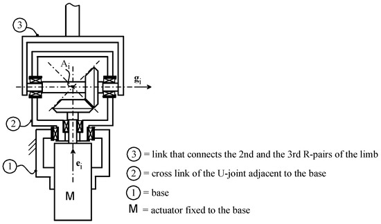 Figure 2 shows a possible mechanical transmission, based on a bevel gearbox that actuates the second R-pair of the i-th limb by keeping the actuator on the base. Figure 3 shows a constructive scheme of the i-th URU limb. Figure 2 and Figure 3 highlight that the actual construction of the proposed type of URU limb is quite simple.