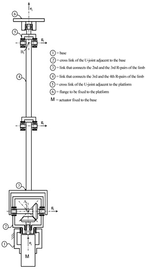 - in each URU limb, the five R-pairs are numbered with an index, j, that increases by moving from the base toward the platform; the actuated joint is the second R-pair;