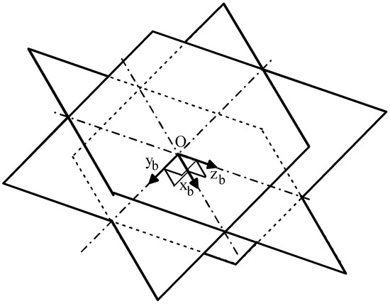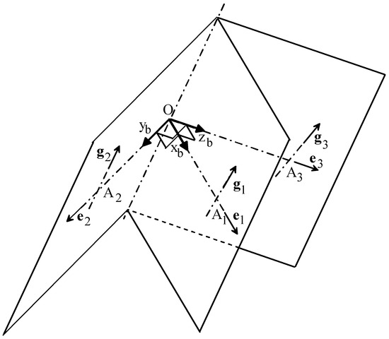 Equation (14) is satisfied when the unit vectors hi, for i = 1, 2, 3, are coplanar. Since the i-th unit vector hi is perpendicular to the plane passing through the coordinate axis of Oxbybzb with the direction of ei where the unit vector gi lies on (that is, to the plane where the cross link of the i-th U-joint lies on (see Figure 1)) and the three so-identified planes always share point O as common intersection, such a geometric condition occurs when these three planes simultaneously intersect themselves in a common line passing through point O (see Figure 4).