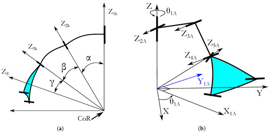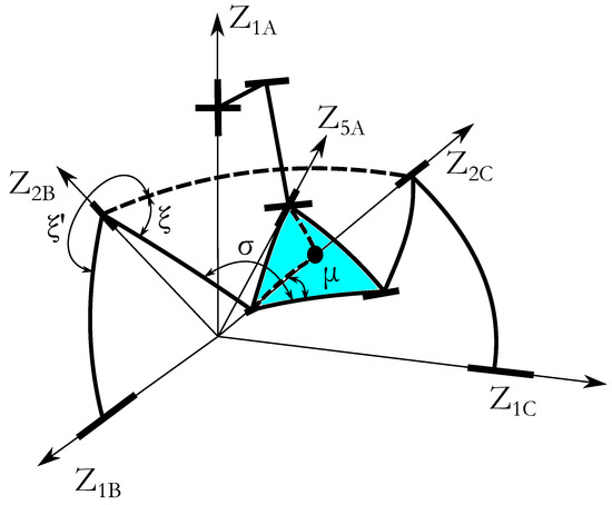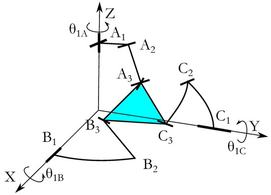 To determine the orientation of the end-effector, the direct serial model of leg B is used. Since, the angle is directly given by the sensor and the angles and may be calculated using the angles, , and, , ( and ).
