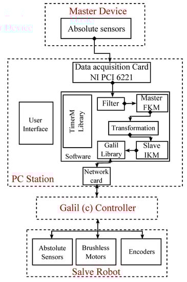 The master device is designed to control the motion of the surgical robot. The motion control scheme is presented in Figure 12. The main control unite is a PC Station. An application was developed to calculate the orientation of the new master device using the sensor data collected using an acquisition card. Then, the corresponding slave orientation is determinate using a transformation method [22]. Finally, the slave active joint motions are solved using the Inverse Kinematic Model of the slave robot. The slave data are transferred to a PLC (the Galil(c) Controller) which controls in real-time the motion of the slave robot.