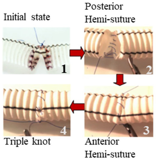 The tele-opertation system is composed of two master devices and two surgical robots. The experiments involved using the teleoperation system to perform sutures on a hollow model simulating a human artery (Figure 13). The suturing method, called anastomosis, consists on the surgical union of two separated hollow organs. The technique is made of three phases beginning by the suture of the back hemisphere, the suture of the front hemisphere and the triple knot, respectively. Figure 14 shows these three phases on a prosthetic aorta.