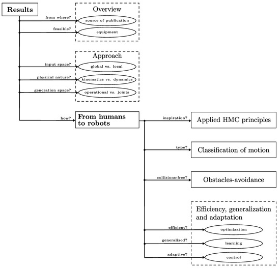 In this section, the results are guided by specific research questions and analyzed according to the schema illustrated in Figure 1. The reviewed papers are firstly examined according to the sources of publication and the equipment used for experimentation (Section 3.1). Then, in Section 3.2, general concepts and assumptions behind the generation of human-like arm motion are investigated by taking into consideration the space of incoming information, the physical nature of the involved variables and the spaces of formation of a trajectory. A deeper analysis is reported in Section 3.3, which describes how different techniques for transferring human regularities into the robotics domain work. Specifically, the applied principles of human motor control (HMC) are discussed (Section 3.3.1) to better understand the underlying inspirational concepts. The included studies are also classified according to the type of movement that is generated (Section 3.3.2) and how obstacles-avoidance is addressed (Section 3.3.3).