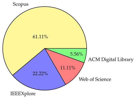 The original search returned 156 results. There were 54 publications left after removing the duplicates across the databases and applying the inclusion and exclusion criteria described in Section 2. The included papers were published starting from 2006 and, therefore, concern the most recent research in the topic. Figure 2 illustrates how the publications are shared among the databases of search. Scopus with 61.11% of papers is clearly the primary source of knowledge. It is followed by IEEEXplore follows with 22.22%, Web of Science with 11.11%, and ACM Digital Library with 5.56%.