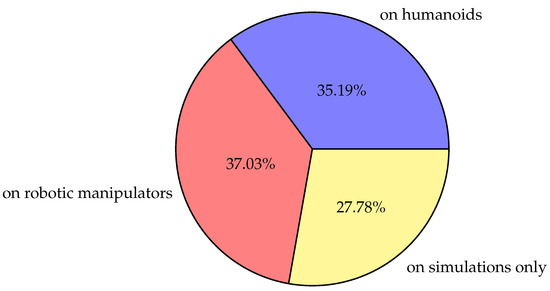 Before describing more in detail the selected studies, an overview concerning the experimental equipment is presented. The types of results were classified according to the robotic systems that were used to validate the proposed methods of human-like arm motion generation. This preliminary distinction is important to deduce implications regarding their level of applicability. For this purpose, the pie chart in Figure 3 illustrates the percentage of papers describing methods that were tested on robotic manipulators (37.03%), on humanoid robots (35.19%), and on simulations only (27.78%).