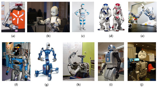 Humanoid robots that have been used to test human-like arm motion generation, namely: ARoS [18] (a), iCub [19] (b), ROMEO [20] (c), NAO [21] (d), ABB FRIDA [22] (e), HRP-2 [23] (f), Rollin’ Justin [24] (g), HERB 2.0 [25] (h), MAHRU [26] (i), and Simon [27] (j).