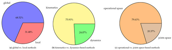 As it can been seen in Figure 5b, 75.93% of the reviewed studies introduced techniques that operate with kinematic variables, while 24.07% of them also considered the dynamics of manipulation. These findings are mainly due to the requirements of simplicity of the proposed solutions, as well as to the fact that most of the studies on human arm motion have been conducted on a kinematic level of the analysis. However, dynamic variables are necessarily introduced in biologically-inspired solutions that aim at replicating the muscles activities in humans. Moreover, the dynamics of a robotic agent is also needed in applications when specific physical interactions with the environment are required.