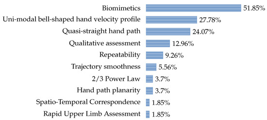 While in classical motion planning techniques the smoothness of a movement is measured by the sum of squared velocities or accelerations along a trajectory [57,58], smooth human arm motion needs to be recognized by the mean of jerk-based metrics [59]. Only the 5.56% of the included studies considered such a validation to assess human-likeness with the generation of limited jerky movements. For instance, the movements generated by the solution from De Momi et al. [55] were also evaluated through a measure of jerk on the principal plane of motion. Specifically, the sum of the squared norms of the jerk vectors in the path is normalized along the total time of execution and the length of the trajectory. This metric offers an independent index of smoothness for the detection of biological behaviors during the analysis of generic reaching movements [59].