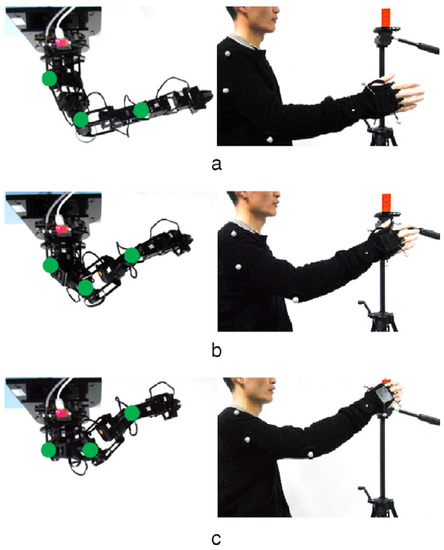 Comparisons of the human grasping movement and the human-like grasping movement of a 7-DOFs robotic arm [43]: (a) the start arm configuration, (b) an intermediate arm configuration, (c) the final arm configuration.