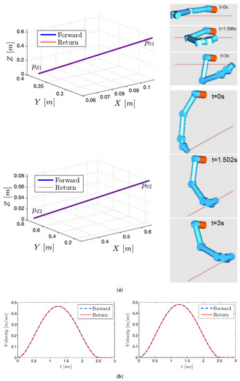 Straight path and a single-peaked bell-shaped velocity profile of the end-effector motion [52]. (a) End-effector paths and joint configurations during unconstrained movement to and . (b) Cartesian velocity profile to (left) and (right).