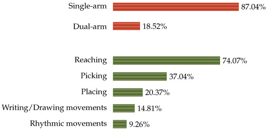 In this section, more insights regarding the type of movements that can be generated by the reviewed solutions are provided. Specifically, a proper classification is necessary to understand better the degree of applicability of the proposed techniques and how they should be upgraded for a wider generalization in different tasks. As Figure 9 illustrates, 87.04% of the included studies addressed human-like single-arm motion generation, while only 18.52% of them proposed techniques for dual-arm motion planning. This outcome certainly depends on the robotic devices that are available for experimentation and on the tasks being addressed. Featured by a limited degree of complexity, reaching (sometimes also called point-to-point) movements have been the focus of the 74.07% of the included studies. This category of movements generally transports an end-effector from one point to another point of the Euclidean space SE (3) without the engagement of any particular manipulation of objects. On the contrary, picking and placing actions of the presented planners concern manipulation of rigid objects in the workspace of a robot. In particular, 37.04% of the reviewed papers addressed the generation of human-like pick movements, while 20.37% of them considered placing (Figure 9). Interestingly, most of the placing actions were part of the planning and execution of more general pick-and-place tasks. A more specialized branch of robotics research in human-like arm motion generation has investigated planar movements for writing/drawing applications and the reproduction of rhythmic trajectories, which regards the 14.81% and the 9.26% of the included studies, respectively (Figure 9). The latter areas of research attract particular attention for their originality and vast unexplored fields of application.