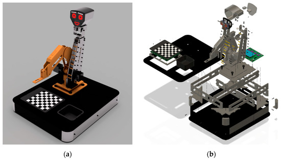 The 3D model of the robot, with 15 cm × 15 cm custom checkers field, robotic arm, and the head with a face: (a) 3D model of the assembled robot; (b) exploding assemblies.