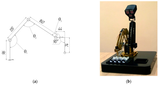 The trajectory of the arm is calculated by the robot controller, and then the robot moves the checker to the desired cell. Since there are no strong limitations for the speed of computation and the precision of the robot moves, the inverse kinematics problem can be solved directly on the controller. The solution utilizes the inverse Jacobian approach, briefly outlined as follows. The kinematic chain is depicted in Figure 2a, where the dependent angle provides the platform where the end effector (pump nozzle) is mounted to be strictly horizontal. The angle is not shown in the figure since it stands for the rotation of the vertical axis of the robot basement.