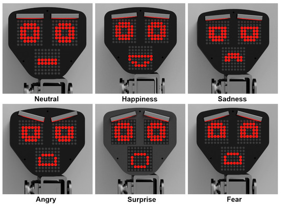 Two emotions (surprise and fear) are used in exceptional cases of in comparison to its previous value. The attitude is prescribed in the program settings and may be “positive” (benevolent) and “negative” (aggressive). When it is set to “positive”, the robot imitates that it empathizes with the human player and rejoices at the user’s good play. When the attitude is “negative”, the robot imitates its aggression and rivalry. The phrases corresponding to the emotional state are occasionally played back describing the robot’s state and giving value judgments on the game, such as: “Brilliant move!” or “Sorry, but I don’t think this move was good for you”. It also asks the user to make another move if the last user’s move was incorrect. The voice messages are transmitted through the laptop speakers or an external powerful speaker if the environment is too noisy—e.g., at exhibitions and shows. Servo motors in the robot neck tilt its head in the direction of the board when the robot makes a move and set the head in a vertical position when it waits for the opponent’s move or speaks a message. Eye LED matrices imitate pupil movements towards the board and the user, and follow the overall emotional expression—see Figure 3.