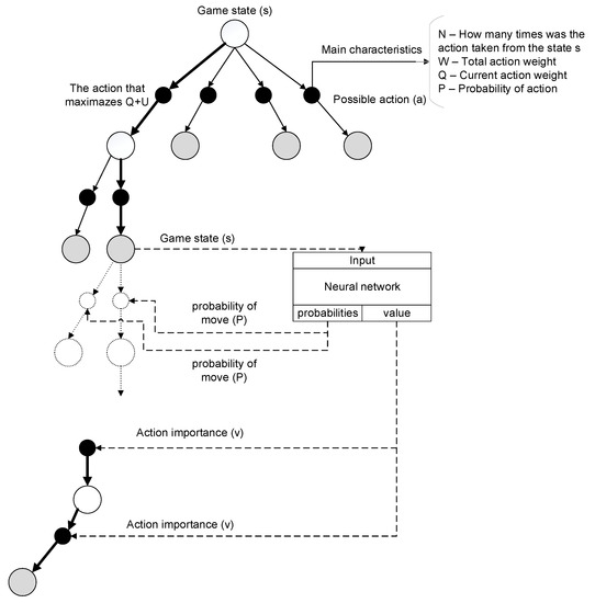 The AlphaZero algorithm contains two basic elements: the Monte Carlo Tree Search Algorithm (MCTS) and the neural network. The MCTS algorithm is a randomized decision tree search. Each node of a decision tree is a field state, and each edge is an action necessary to reach the corresponding state. In order to perform decision making, the algorithm simulates the game, during which the player moves from the root of the tree to the leaf.