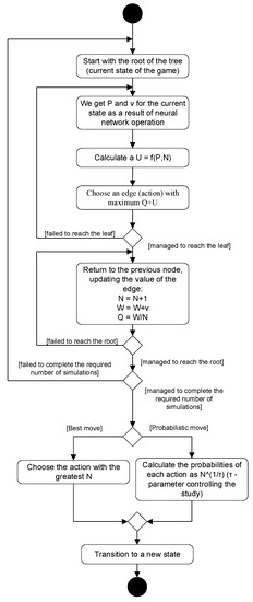 where τ is the “temperature” parameter controlling the degree of exploration. When τ is 1, the algorithm selects moves randomly taking into account the number of wins. When τ → 0, the move with the largest number of wins will be selected. Thus, τ = 1 allows exploration, and τ→ 0 does not. The activity diagram of MCTS is shown in Figure 5. When the search is complete, the move is selected by the algorithm randomly proportional to its probability found by MCTS.