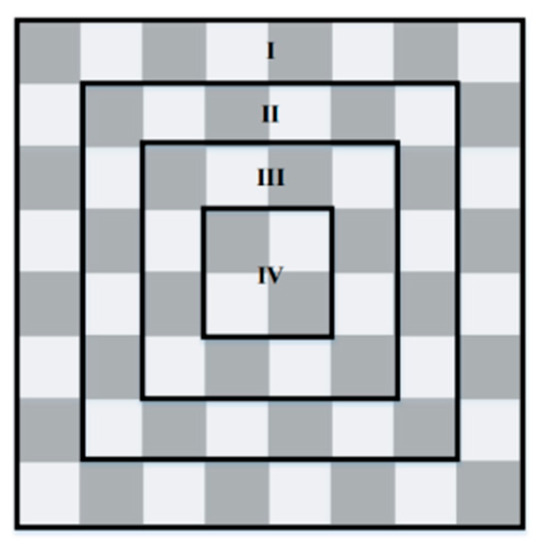 The checkers board contains four areas depending on how many moves a checker can perform from it—see Figure 6. Each area of smaller size contains four fewer black cells and two more moves—see Table 1.