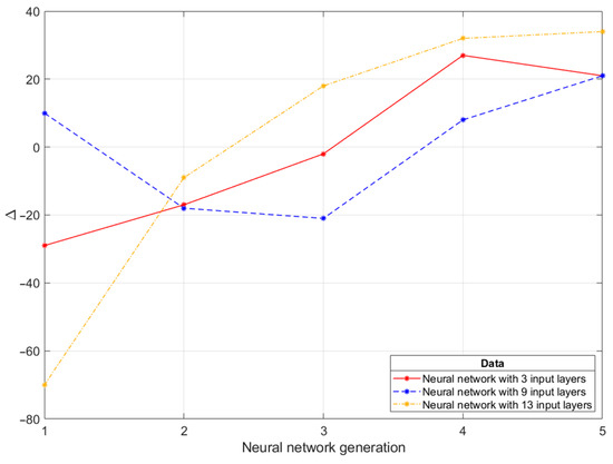 Using a three-layer neural network, each subsequent generation is progressing, but as we see in the fifth generation, during training, the network can also decrease its performance despite the superiority of the previous version. This is particularly evident in the neural network with 9 input layers, where there was a perceptible failure because the learning process went in the wrong direction. Since the 4th generation, the network has started to grow qualitatively. This indicates that even an ill-trained neural network is capable of retraining and improving initial results. The curve of the neural network with 13 input layers shows that it asymptotically approaches the limit of its learning, and each new generation is progressing less than the previous.