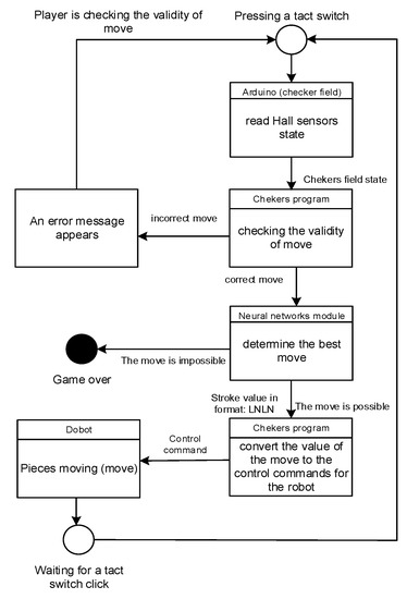 Figure 9 presents a diagram of the Russian checker robot algorithm. After the software module based on AlphaZero has received the data on checker field state, it produces the move and returns the corresponding command set to the robotic setup.
