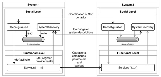 A system of systems consisting of two systems presented with their internal architectures. SystemDiscovery makes the systems aware of each other. Reconfiguration composes the services across the systems in a decentralized manner. The services implement functionality of the individual systems and the functionality of the emerging system of systems. SystemCatalog is designed as an event channel to achieve greater decoupling of the components and avoid polling of Reconfiguration.