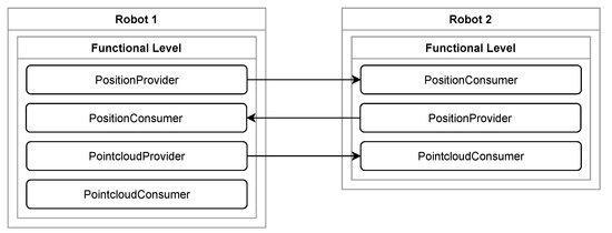 Composition of services across two robots after reconfiguration. The arrows present the data flow of the payload of the services. The service PointcloudConsumer of robot 1 is inactive, as the second robot is not able to offer pointclouds. The presented functional levels fit into the architecture presented in Figure 1.