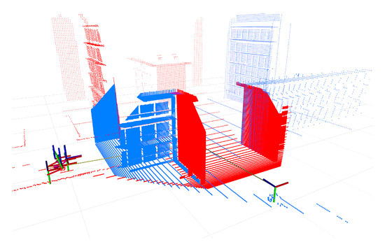 Two robots built up a system of systems to exchange pointclouds and fuse these with their own data. This figure shows the perception of the robot in the left. Its own sensor data is visualized in blue and the received sensor data is visualized in red. The colored threepart structures represent the positions of the robots and their components. By using PointcloudShare, the robot is also aware of the position of the 3D sensor serving the pointclouds.