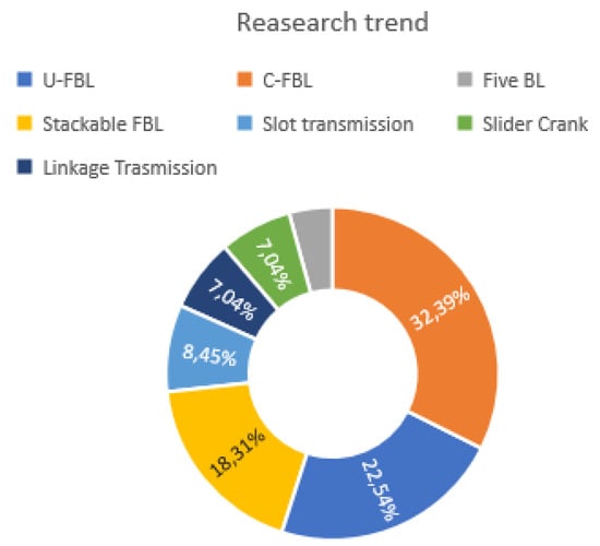 Developed by Hunter et al. [30], the drawing shown in the second row of Table 3 is fairly self-explanatory: a motor 26 causes rotation of a screw and moves longitudinally to the proximal element 24, along the slot 42, the screw nut boss 22 (hinge 21) forcing to flex the distal body 38 around the hinge 36. In addition, in this case, a simple inverse four-bar system is used.