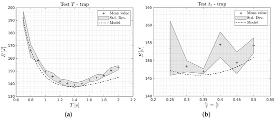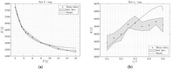Two different tests are considered, named Test T and Test . In Test T, the same values for acceleration and deceleration times are considered and set equal to , while different values for the time period T are tested (Figure 6a). In particular, T ranges from 0 to with an interval of with and in the other cases. In Test , a fixed period time is considered, while the value of is varied from to with an interval of (Figure 6b).